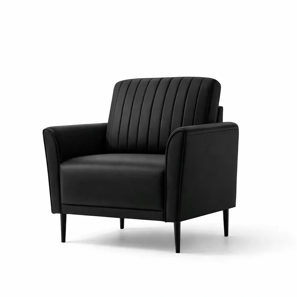 The armchair features a smooth PU finish and vertical stitching.