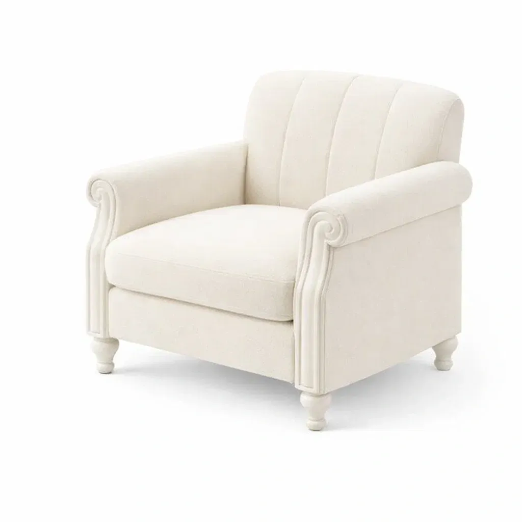 Armchair Cream Fabric Upholstered with Rolled Arms and Wooden Legs 75cm x 80cm x 90cm